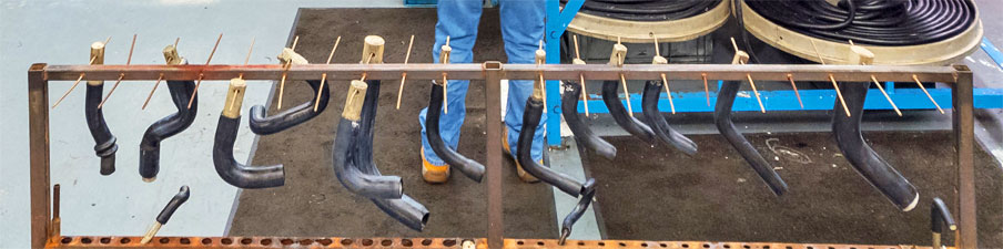SHAPED MANDRELS : Typical shaped mandrels and their respective hoses ![]() Rubber tubing on mandrels hang on racks ... all tools have a wired on identity tag. We have a substantial range to cover most applications ![]() PRODUCTION : The operator pushes extruded tubing onto the shaped mandrel, with each mandrel being the shape of the required hose